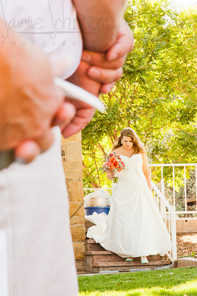 Bride walking down the aisle on the east side of the Stone House with photo courtesy of Jaimie Johnson Photography